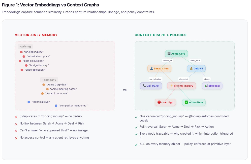 Here’s what this looks like in practice. On the left: vector-only memory. Dots floating in embedding space. Five duplicates of “pricing inquiry” with no dedup, no connection between Sarah → Acme → Deal → Risk. On the right: a context graph with policies. One canonical entity per concept, full traversal paths, every node traceable.