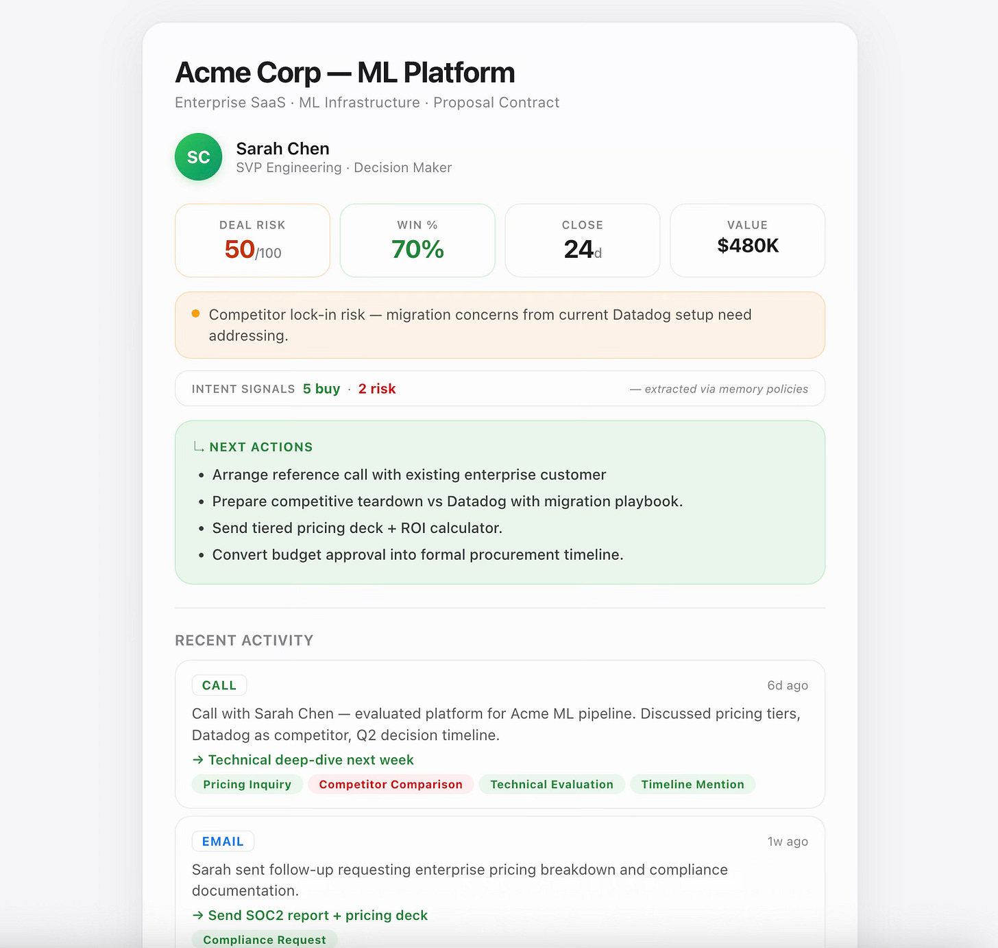 }Think about what this means in practice. Your agent ingests a call transcript and auto-extracts entities into the graph via memory policies. Five minutes later, your sales dashboard — built with React, Svelte, whatever — queries that same graph via GraphQL and renders deal risk, buy/risk signal counts, activity timelines, contact relationships, and recommended next actions. No ETL pipeline. No data warehouse sync. No “wait for the nightly batch.” The graph is the source of truth for both the agent and the UI.