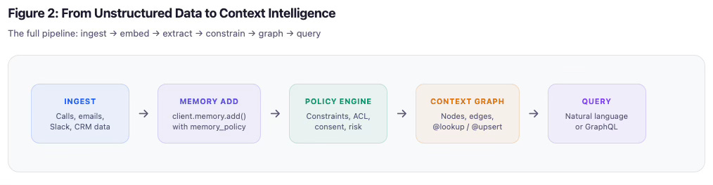 The full pipeline looks like this: unstructured data — calls, emails, Slack threads, CRM exports — flows into client.memory.add() with a memory policy. From there it passes through the policy engine, which applies constraints, checks ACL, validates consent and risk. The output gets structured into the context graph: nodes, edges, @lookup and @upsert enforcement. And then it’s queryable — either through natural language search for agents, or through GraphQL for dashboards and UIs.