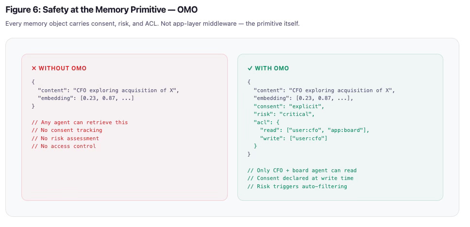 This is the key architectural insight: safety must live at the memory primitive, not the application layer. If an agent can access the raw memory store — through a tool call, a prompt injection, or a scheming strategy — application-level access controls are meaningless. The memory object itself needs to know who’s allowed to read it, whether it was consensually captured, and how sensitive it is.
