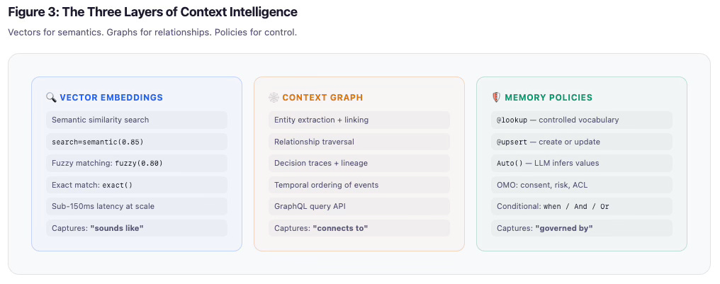 Here’s how I think about the three layers working together. Vectors capture “sounds like” — semantic similarity, fuzzy matching, exact match, sub-150ms on-device latency at scale. The context graph captures “connects to” — entity extraction, relationship traversal, decision traces, temporal ordering, GraphQL query API. Memory policies capture “governed by” — @lookup for controlled vocabulary, @upsert for dynamic entities, Auto() for LLM-inferred values, OMO safety fields, conditional constraints.