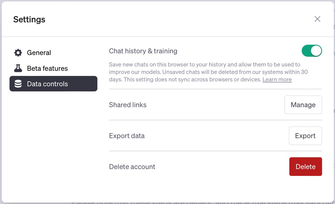 Note - this settings is browser and device specific. So you will need to use mobile app or other browsers to toggle this setting OFF to make sure your data is not being saved and used for LLM training.